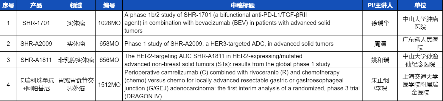 本次ESMO大会,将由中山大学肿瘤医院徐瑞华教授、广东省人民医院周清教授、中山大学孙逸仙纪念医院姚和瑞教授、上海交通大学医学院附属瑞金医院李琛教授分别就4项AG百家乐医药创新产品相关研究做口头报告,包括SHR-1701、SHR-A2009、SHR-A1811这3款未上市创新产品的实体瘤治疗临床研究,以及1项“双艾”组合(卡瑞利珠单抗联合阿帕替尼)治疗局部晚期可切除胃/胃食管交界处癌的Ⅲ期临床试验期中分析。