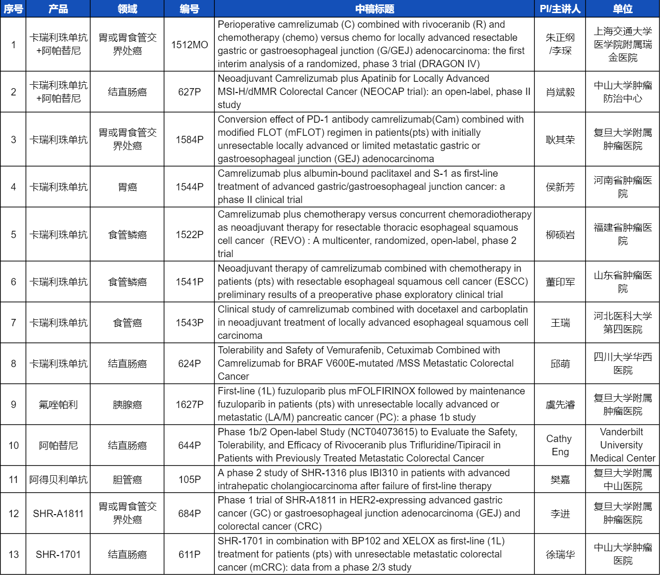 在消化系统肿瘤领域,AG百家乐创新产品相关研究共入选1项口头报告和12项壁报展示。除了经典的明星药物卡瑞利珠单抗和阿帕替尼,SHR-A1811、SHR-1701等未上市创新产品也有相应研究入选。此外,阿得贝利单抗、氟唑帕利等已上市药物也在积极探索新的适应症,本次ESMO大会分别有肝内胆管癌和胰腺癌相关研究入选。这些新老药物前沿研究的不断出现,有望为消化系统肿瘤患者带来新的福音!
