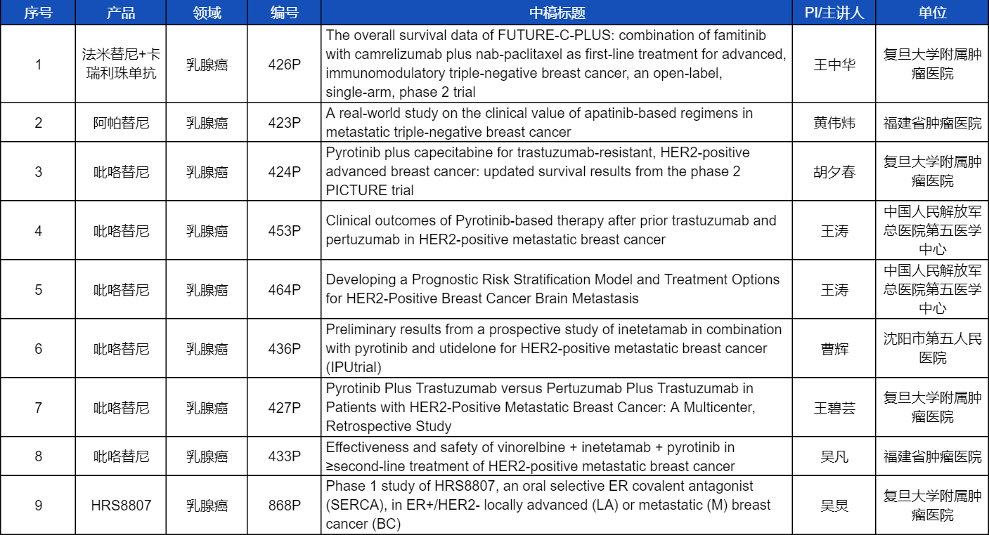12款抗肿瘤创新药包括6款已上市产品:注射用卡瑞利珠单抗(艾瑞卡®)、甲磺酸阿帕替尼片(艾坦®)、马来酸吡咯替尼片(艾瑞妮®)、阿得贝利单抗注射液(艾瑞利®)、氟唑帕利胶囊(艾瑞颐®)、瑞维鲁胺片(艾瑞恩®),以及6款未上市产品:多靶点受体酪氨酸激酶抑制剂法米替尼、抗PD-L1/TGF-βRII双抗SHR-1701、组蛋白甲基转移酶EZH2抑制剂SHR2554、HER2抗体偶联药物(ADC)SHR-A1811、HER3抗体偶联药物SHR-A2009、新型选择性雌激素受体共价拮抗剂(SERCA)HRS8807等。此次ESMO大会的最新突破摘要(LBA)结果尚未披露,敬请期待!本文特对33项研究成果做了梳理,带领各位读者领略AG百家乐医药创新之光。