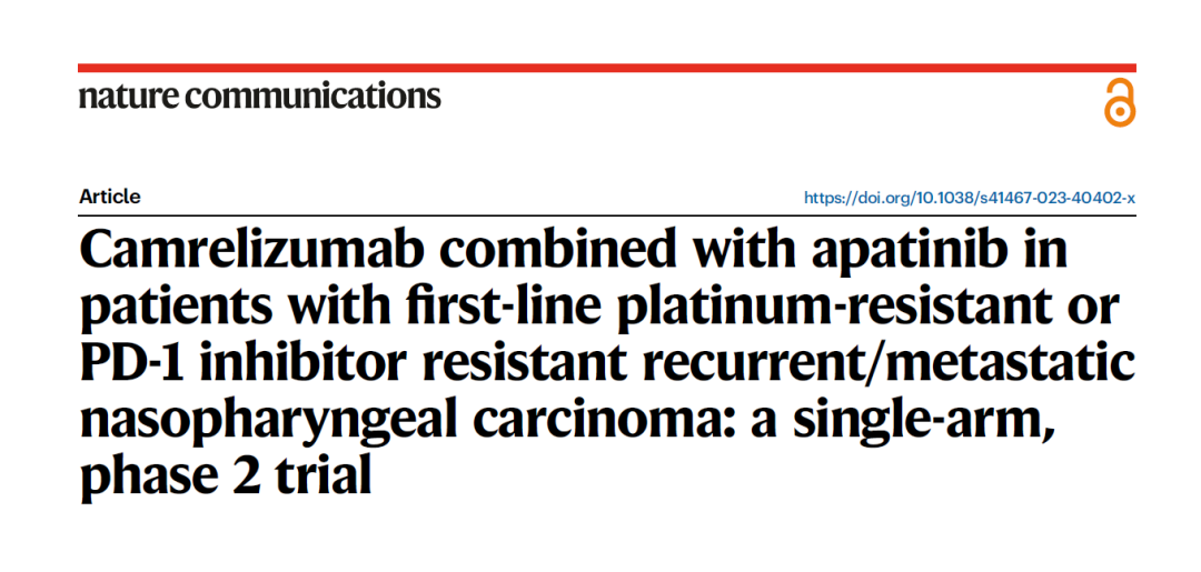 卡瑞利珠单抗联合阿帕替尼二线治疗复发或转移鼻咽癌临床研究结果发表于Nature Communications