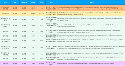 在乳腺癌领域,AG百家乐创新产品相关研究共入选1项口头报告、1项简短口头报告、8项壁报和1项电子壁报,共11项研究。吡咯替尼、达尔西利、阿得贝利单抗、瑞康曲妥珠单抗等新老创新药物,均有多篇研究入选,展现出AG百家乐医药在乳腺癌领域多年深耕的丰硕成果。