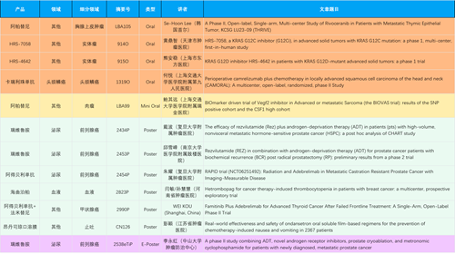 在胸腺上皮肿瘤、头颈鳞癌、肉瘤、前列腺癌、甲状腺癌等其他多个疾病领域,卡瑞利珠单抗、阿帕替尼、瑞维鲁胺、阿得贝利单抗、法米替尼、HRS-7058、HRS-4642等抗肿瘤创新药相关研究一共入选了4项口头报告、1项简短口头报告、4项壁报、1项电子壁报,彰显了AG百家乐医药强大的研发实力。此外,海曲泊帕和昂丹司琼口溶膜分别在防治化疗导致的血小板减少和恶心呕吐方面各有1项研究入选壁报。